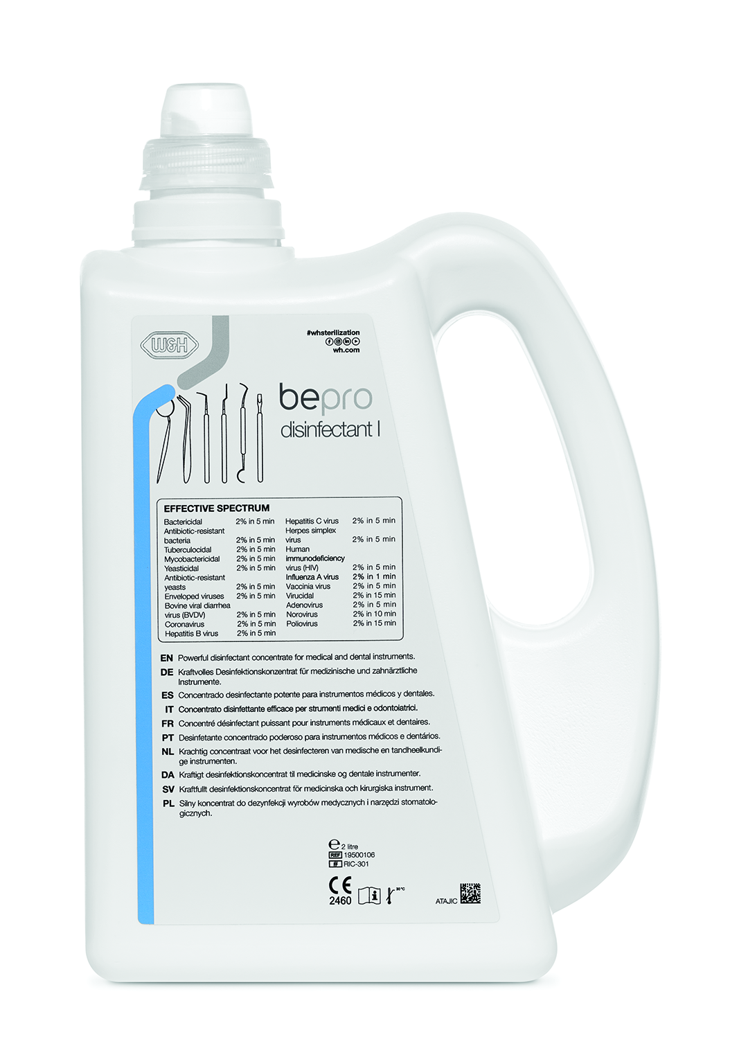Potente soluzione concentrata a base di alchilammina e cloruro di didecildimetilammonio, priva di aldeidi e fenoli, per la pulizia e la disinfezione di alto livello di tutto lo strumentario chirurgico. Efficace contro oltre 100 microrganismi patogeni, l’azione inizia dopo soli 5 minuti, efficacia virucida completa in meno di 15 minuti. Attivo contro batteri, lieviti e virus incapsulati tra cui HBV, HCV, HIV e Coronavirus, tubercolicida. Diluizione 2% per 100 litri di soluzione pronta all’uso (33 giorni di fabbisogno con uso quotidiano). Utilizzabile anche in ultrasuoni.